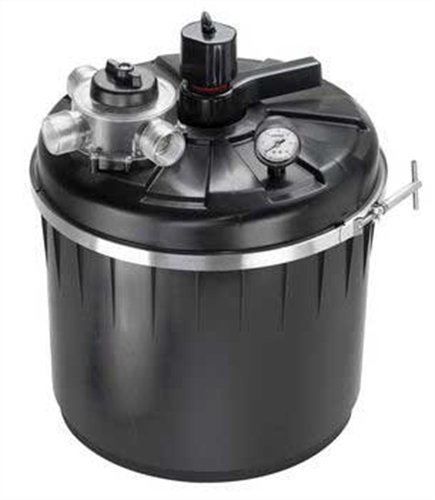 Pressurized filter with UV light for 2000-gallons ponds features a unique, manually operated agitator for dislodging over 90 percent of the pond residue that accumulates in the filter chamber. This patent pending feature is employed during the backwash and rinse operation. Available with or without an internally mounted, integrated UV filter light to control green water. Agitator unlocks waste from media saving the amount of water discharged during backwash and rinse cycles. Unique, patent pending 3-way master valve locks into run" "rinse" and "backwash" settings. Clear-vue inspection port to monitor water clarity during backwash/rinse operation. Positive pressure lock ring to ensure a tight water seal. Bio-Matrix media affords maximum surface area for beneficial bacteria growth. Heavy duty poly canister can be buried for hidden installation. Integrated waterproof UV transformer (on units with UV light). 1-1/2in threaded fittings ball valves for waste line and swivel fitting included. For pumps of 1000 to 2000-GPH with 20-feet maximum pumping height."