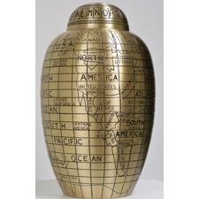 9699-10 Features: -Adult urn.-Material: Brass.-Threaded, airtight screw-on lid and comes with a velvet carrying pouch.-220 CI capacity. Color/Finish: -World map over a brass colored background. Dimensions: -Height: 10''.
